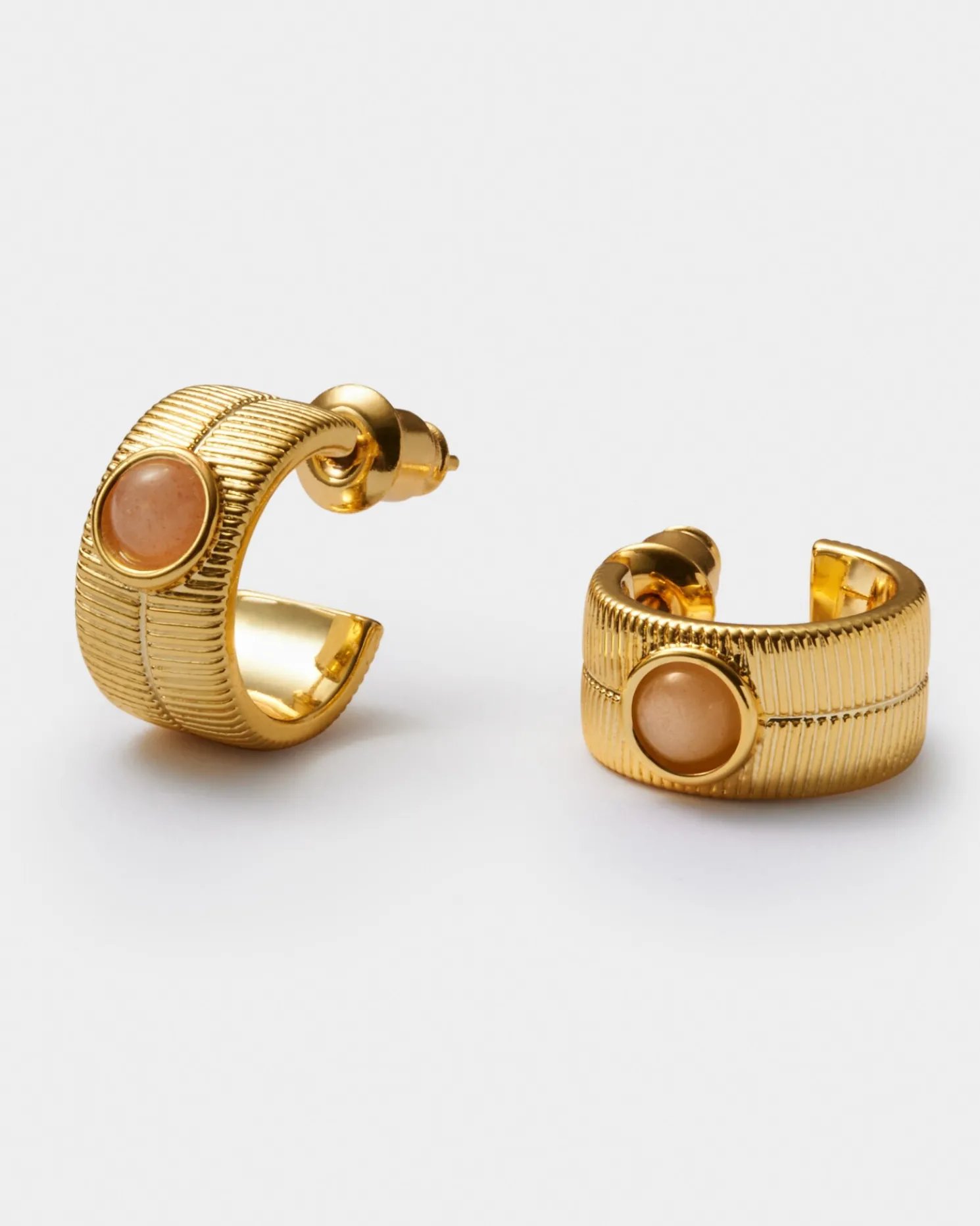 Our ‘July’ Birthstone Hoop Earrings are designed in durable 18K Gold PVD coating, making them certified waterproof, sweat-proof, and life-proof. Featuring the month’s real semi-precious stone, Sunstone, they’re beautifully presented in a reusable suedette jewellery pouch and on a personalisable card that highlights the birthday girl’s unique traits. Pair with the complete Birthstone Collection for the perfect gift.