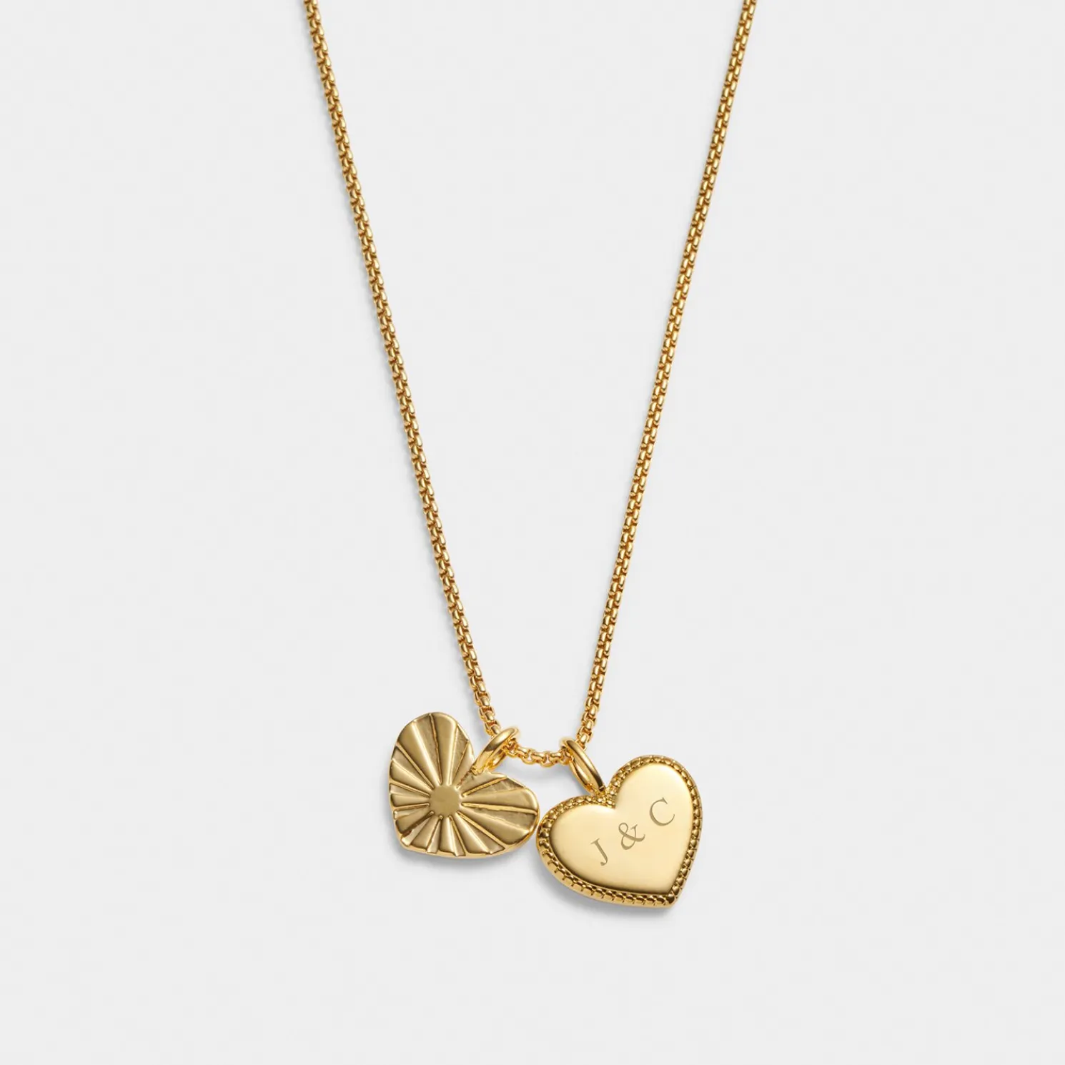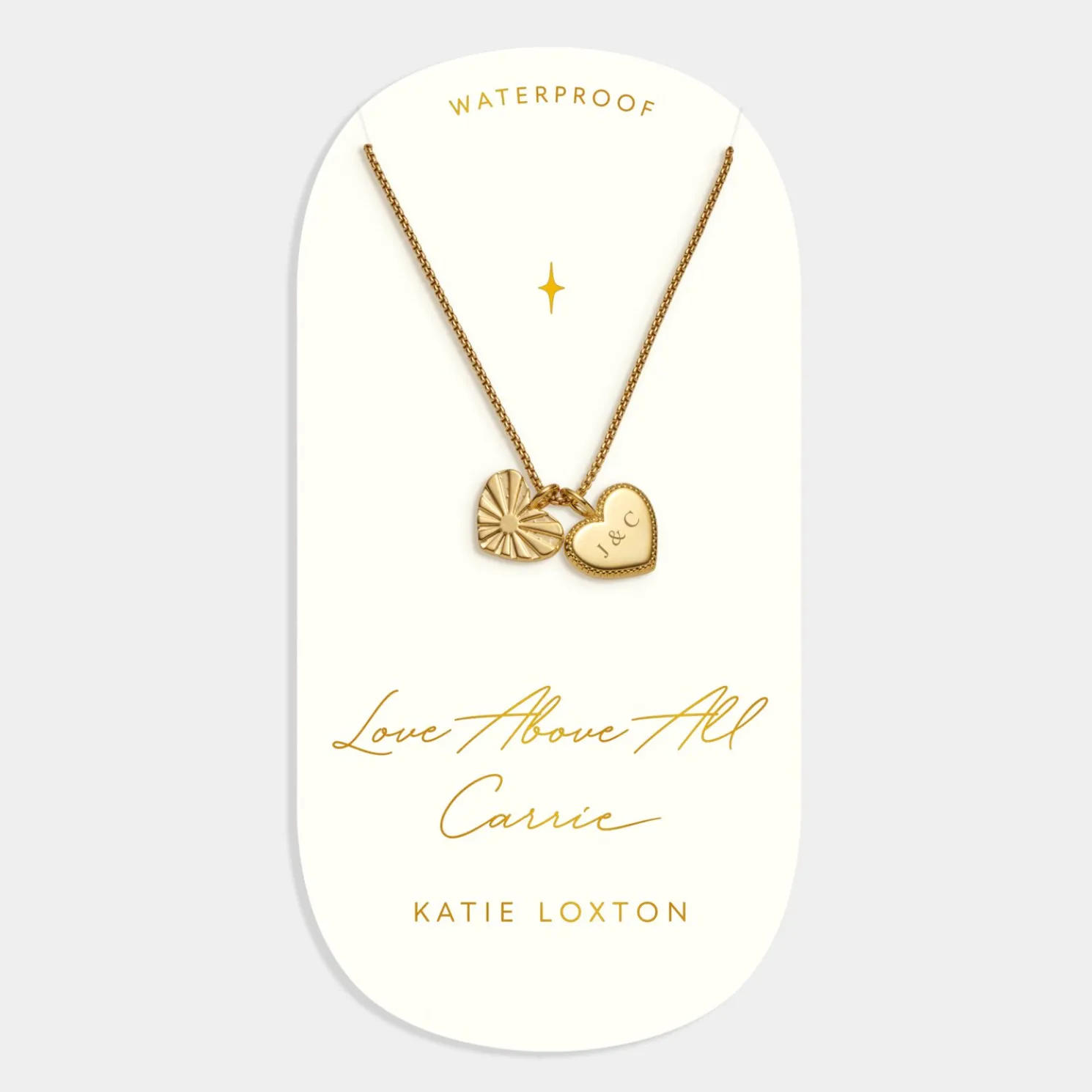 Share the love, whatever the occasion, with our ‘Love Above All’ Waterproof Gold Charm Necklace. Presented on a premium card that is printed with the golden sentiment, this beautiful necklace is designed in durable 18K Gold PVD Coating – meaning it is waterproof, sweat proof and life proof – and holds two heart-shaped charms. With four fonts to choose from, you can make this style uniquely theirs by adding up to 8 engraved characters – including letters, numbers and selected symbols – to the base heart-shaped charm. As much of a joy to gift as it is to receive, whatever the occasion, this pretty style comes with a reusable suedette jewellery pouch and one of our Free Gift Bag With Orders.